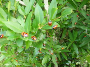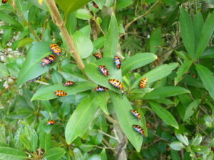 いつもは葉の裏でかたまってじっとしているオオキンカメムシですが、今朝見に行くと、三々五々葉の上に止まっていました。