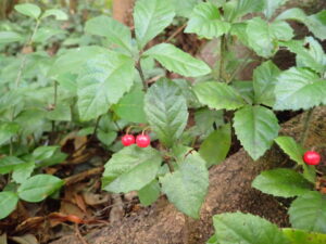 茎に毛はなし ツルコウジより実も一回り大きい ヤブコウジ