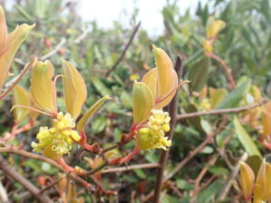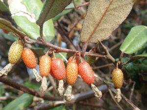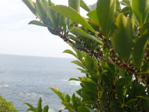 ビジターセンター玄関を出て右に遊歩道を10分程歩きますと、松尾展望広場に到着します。1段下(段差がきついので降りる際にはご注意ください)まで降りますと、目の前に広がる景色は、爽快です。又、ヒサカキ、ナワシログミ、サルトリイバラなど、目の前で見られる。